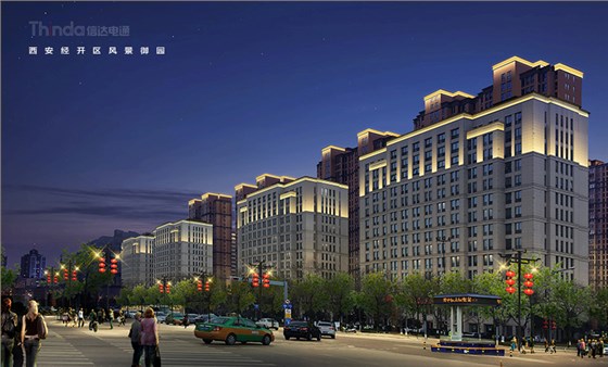 風景御園與保億隆基中心并排矗立,都位于西安市政府對面,建筑立面為淺色石材,屬于高層建筑。信達電通對樓體采用不同等級照明,一級亮度營造天際線的效果,二級亮度凸顯建筑本身的肌理,三級亮度是樹木的照明點綴。等級照明方案打造立面層次韻律,又不失市政中心建筑的優雅和莊重。
