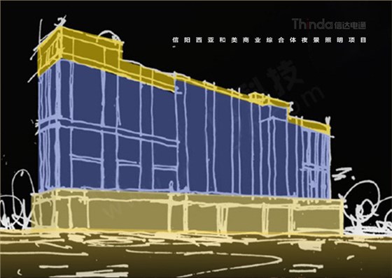 信陽西亞和美商業廣場照明設計中,整棟樓體的亮度共分三級,建筑頂部形成整體為一級照明,凸顯頂部結構,提高建筑夜間標示性照明效果。其他部分明暗有別,錯落有致,有能起到營造繁華、時尚的商業氛圍,促進商業價值的同時,又形成商業功能特征。
