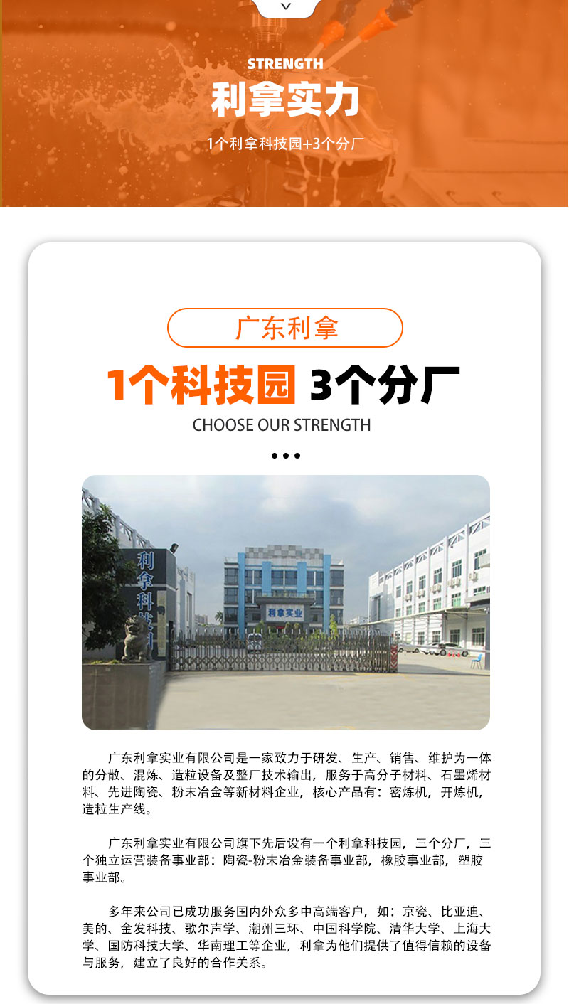 廣東利拿實業有限公司厚街分公司是一家致力于研發、生產、銷售、維護為一體的分散、混煉、造粒設備及整廠技術輸出,服務于高分子材料、石墨烯材料、先進陶瓷、粉末冶金等新材料企業,核心產品有:密煉機,開煉機,造粒生產線。